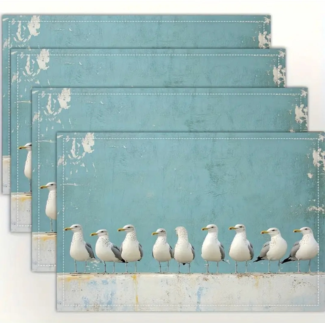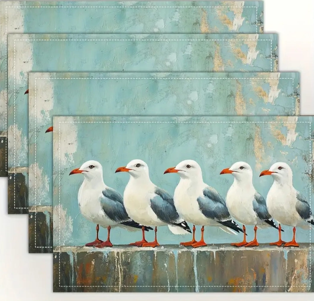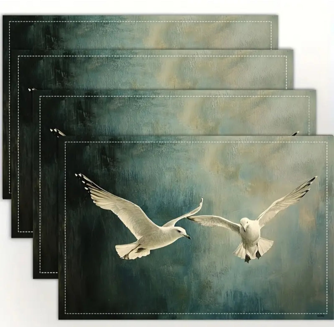 Enhance your dining experience with our set of 4 Seagull placemats. Made from rustic linen material, these 30.48x45.72 cm mats provide both style and practicality to your table setting. Protect your surfaces while adding a touch of seaside charm.